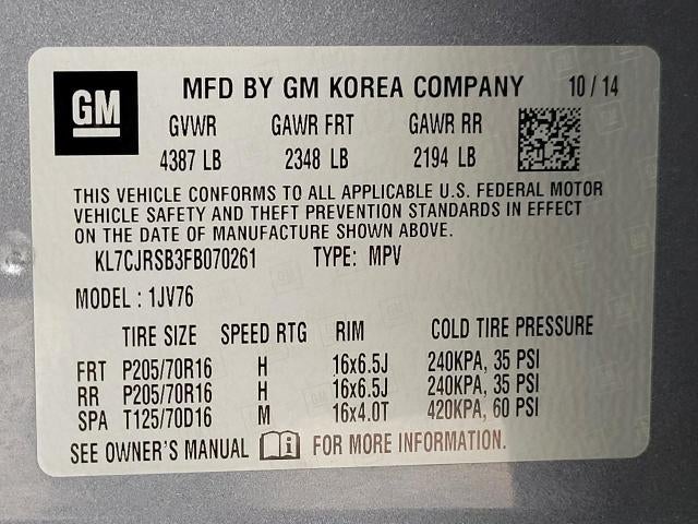 Bergstrom Chevrolet Buick Cadillac of Neenah wants to buy your vehicle - even if you don't buy ours. Get your free and quick offer to purchase. To get our top dollar offer, call our Bergstrom Buying Team Hotline at 920-429-6222. LT Plus Package (3-Spoke Leather-Wrapped Steering Wheel, 6-Way Power Driver Seat Adjuster, Deluxe Cloth/Leatherette Seat Trim, and Rear Park Assist w/Sensor Indicator), Preferred Equipment Group 1LT, 16" Aluminum Wheels, 2-Way Manual Front Passenger Seat Adjuster, 3.53 Final Drive Axle Ratio, 4-Wheel Disc Brakes, 6 Speakers, ABS brakes, Air Conditioning, Alloy wheels, AM/FM radio: SiriusXM, Brake assist, Bumpers: body-color, Compass, Delay-off headlights, Deluxe Cloth Seat Trim, Driver door bin, Driver vanity mirror, Driver's Seat Mounted Armrest, Dual front impact airbags, Dual front side impact airbags, Electronic Stability Control, Emergency communication system: OnStar Directions & Connections, Exterior Parking Camera Rear, Front anti-roll bar, Front Bucket Seats, Front Bucket Seats w/Driver Power Lumbar, Front reading lights, Front wheel independent suspension, Fully automatic headlights, Heated door mirrors, Illuminated entry, Knee airbag, Low tire pressure warning, Occupant sensing airbag, Outside temperature display, Overhead airbag, Panic alarm, Passenger door bin, Passenger vanity mirror, Power door mirrors, Power steering, Power windows, Premium audio system: Chevrolet MyLink, Radio data system, Radio: Chevrolet MyLink AM/FM Stereo, Rear seat center armrest, Rear side impact airbag, Rear window defroster, Rear window wiper, Remote keyless entry, Roof rack: rails only, Security system, Speed control, Speed-sensing steering, Split folding rear seat, Spoiler, Steering wheel mounted audio controls, Tachometer, Telescoping steering wheel, Tilt steering wheel, Traction control, Trip computer, and Variably intermittent wipers.